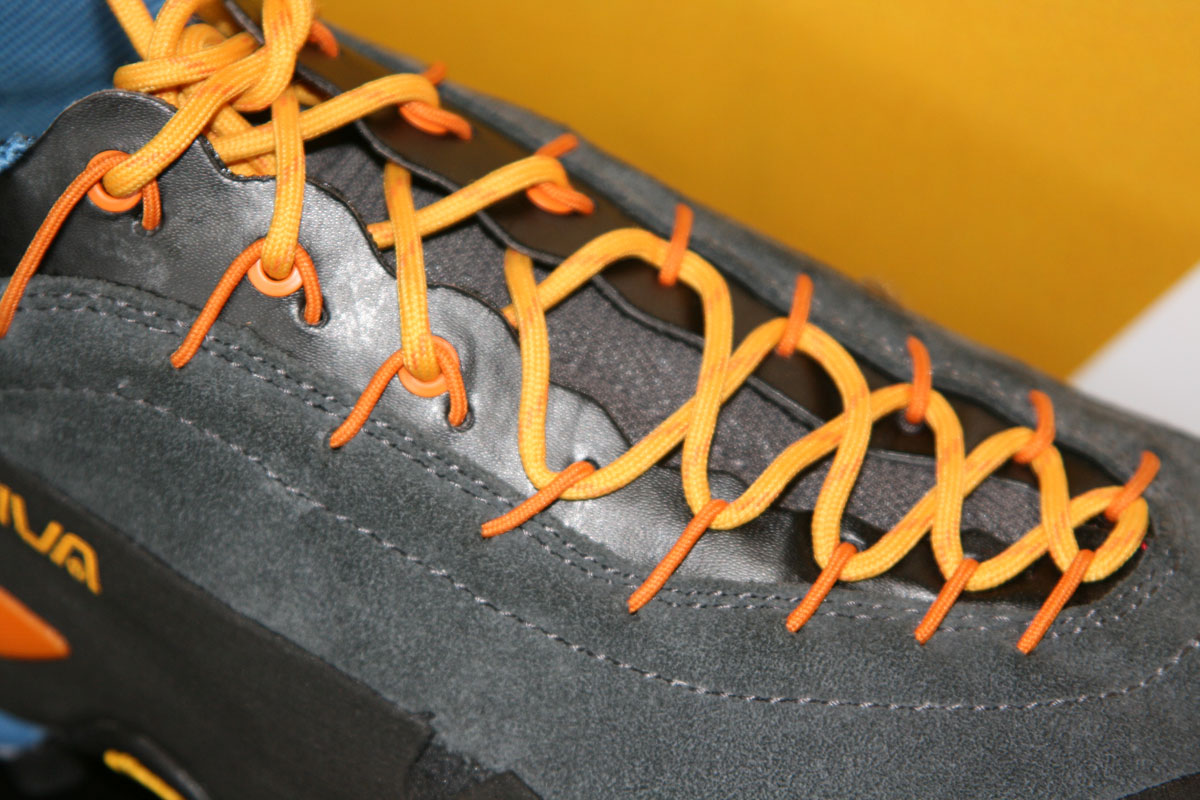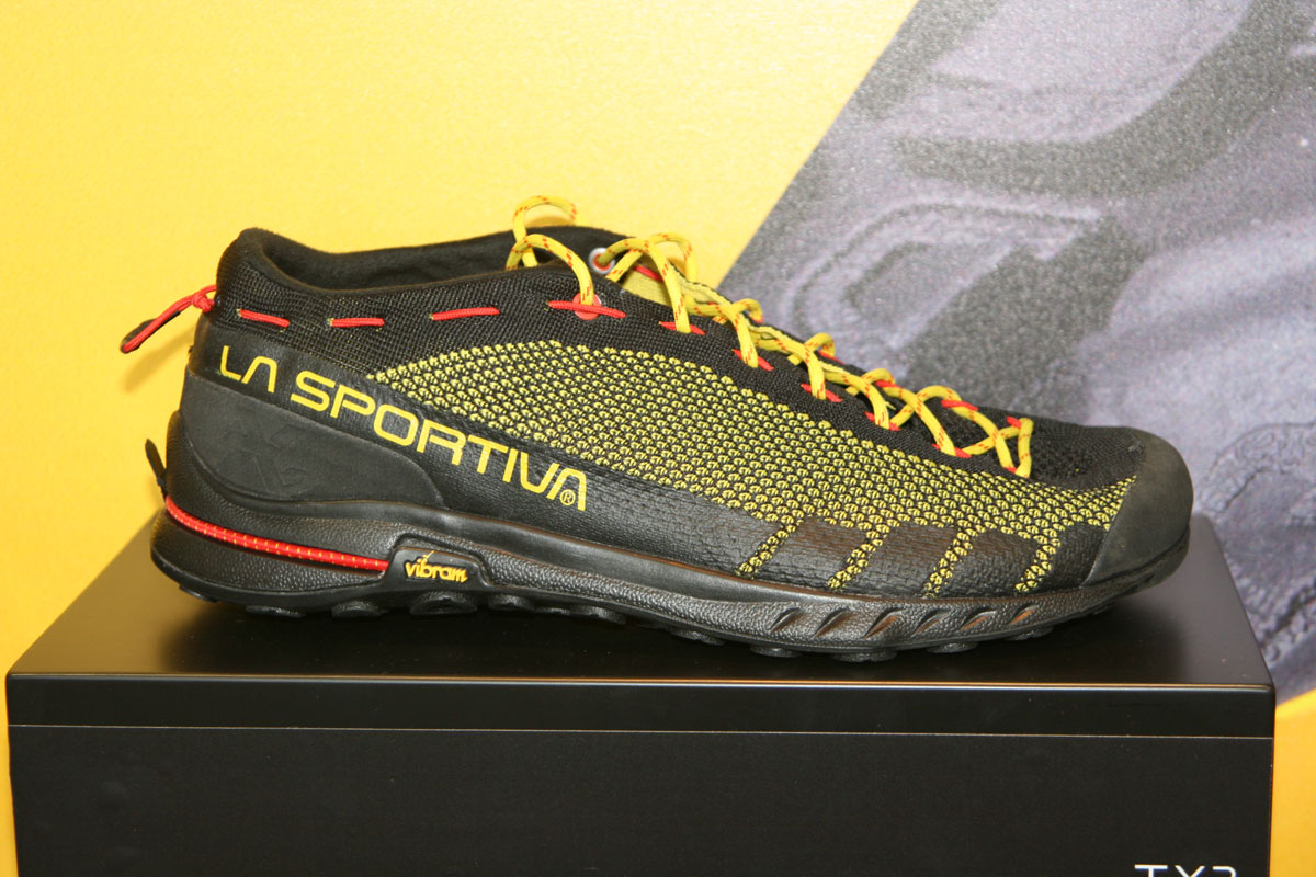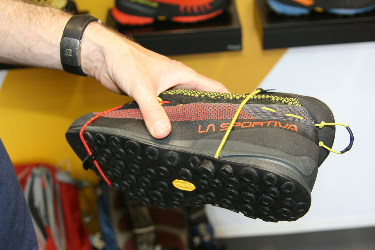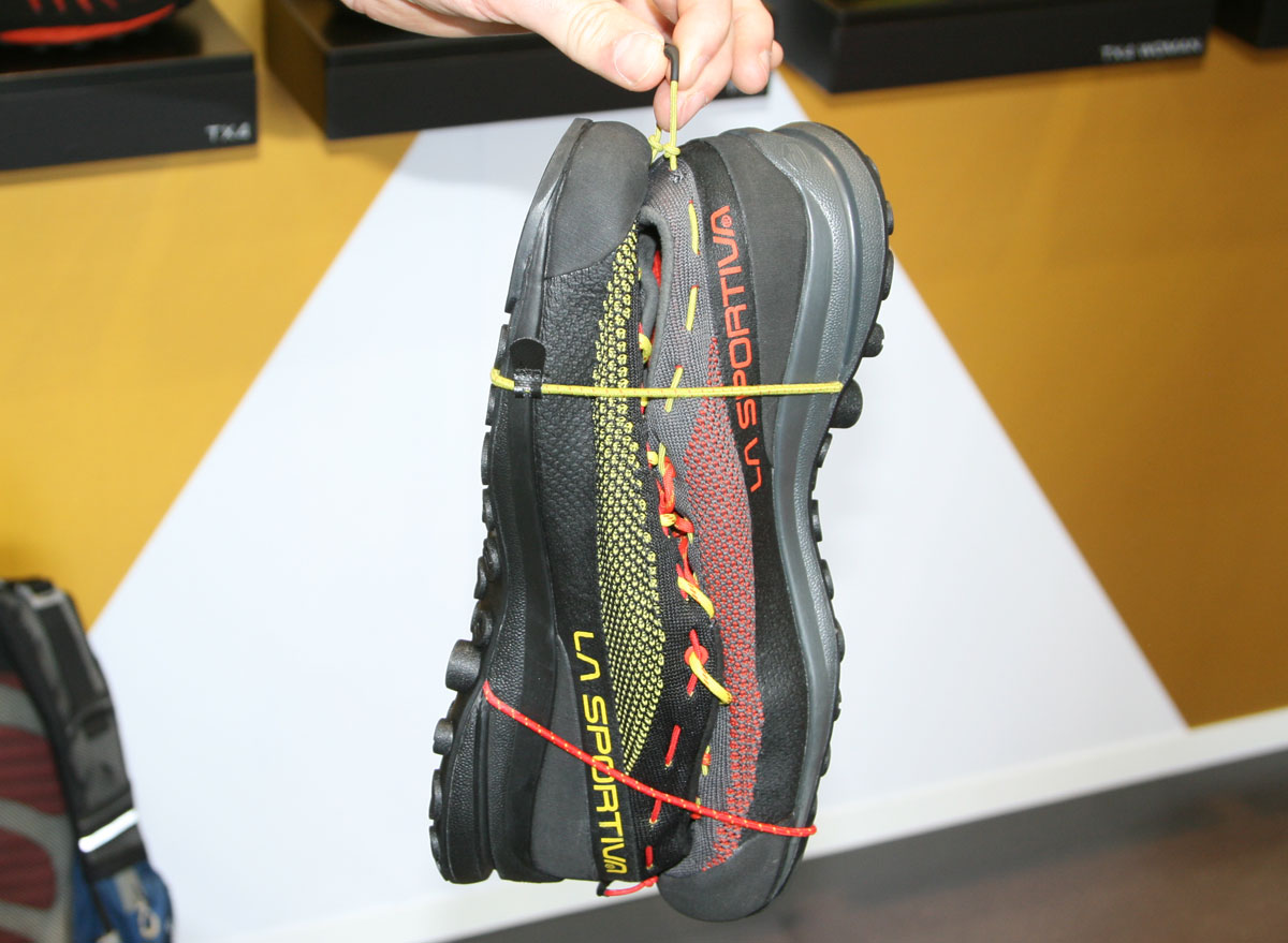The TX2 is the same price, but lighter and slimmer – just 560g per pair says La Sportiva. Again there’s a Vibram MegaGrip sole unit, Mythos-style lacing and EVA midsole, but the shoe’s most distinctive feature, a USP even, is the ‘C2 Combo Cord’.