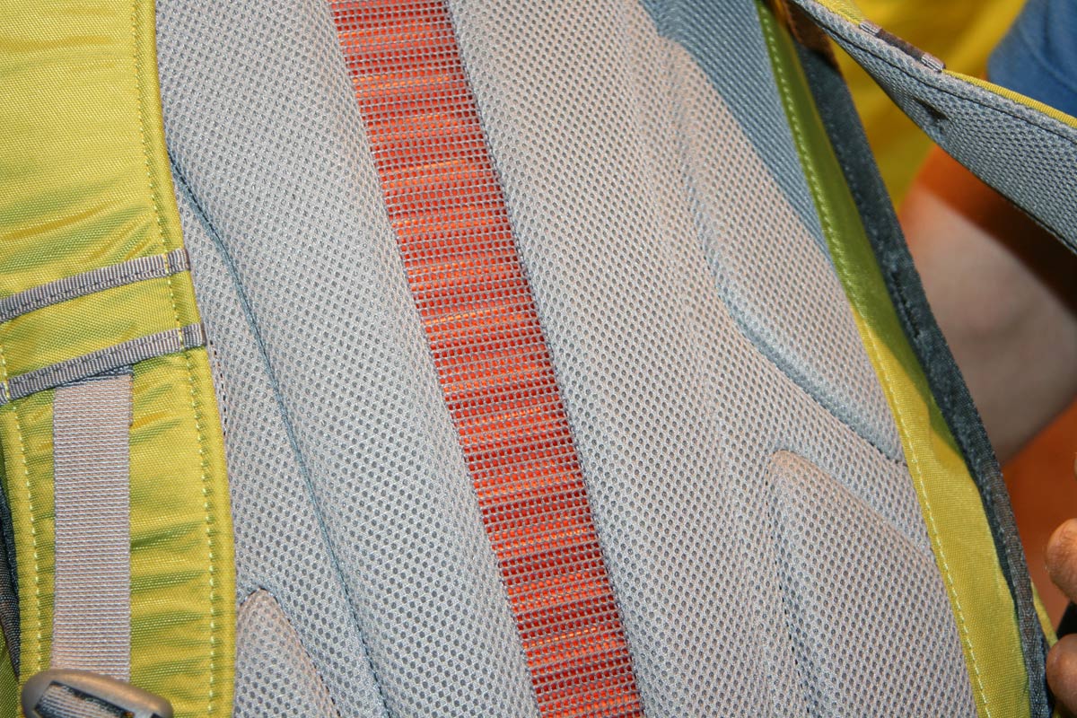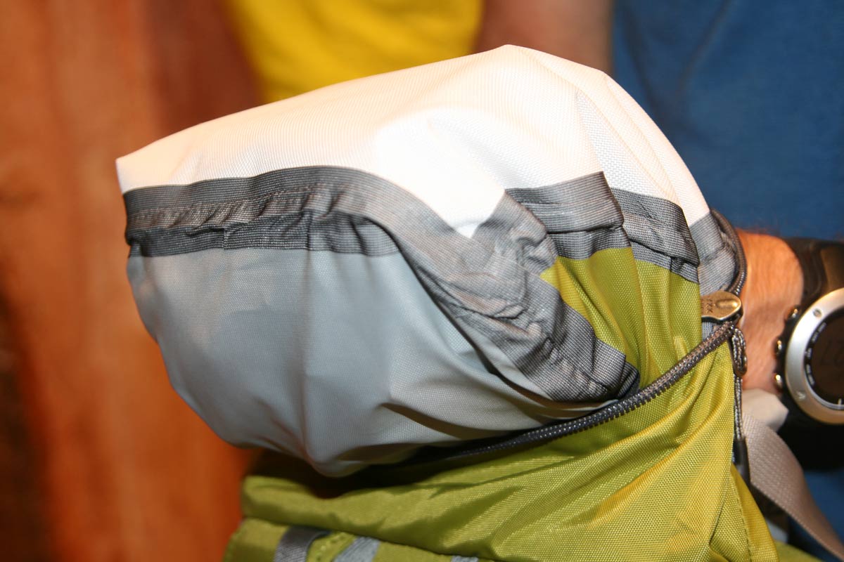 The lid, as you can see from the image on the right, incorporates a pocket, which is also waterproof, but in this case using taped seams. Other stuff includes an external hydration sleeve, rope strap under lid, deep side pockets and a claimed weight of just 770g. The back system is a sort of semi-vented foam with a central channel, see image above.
