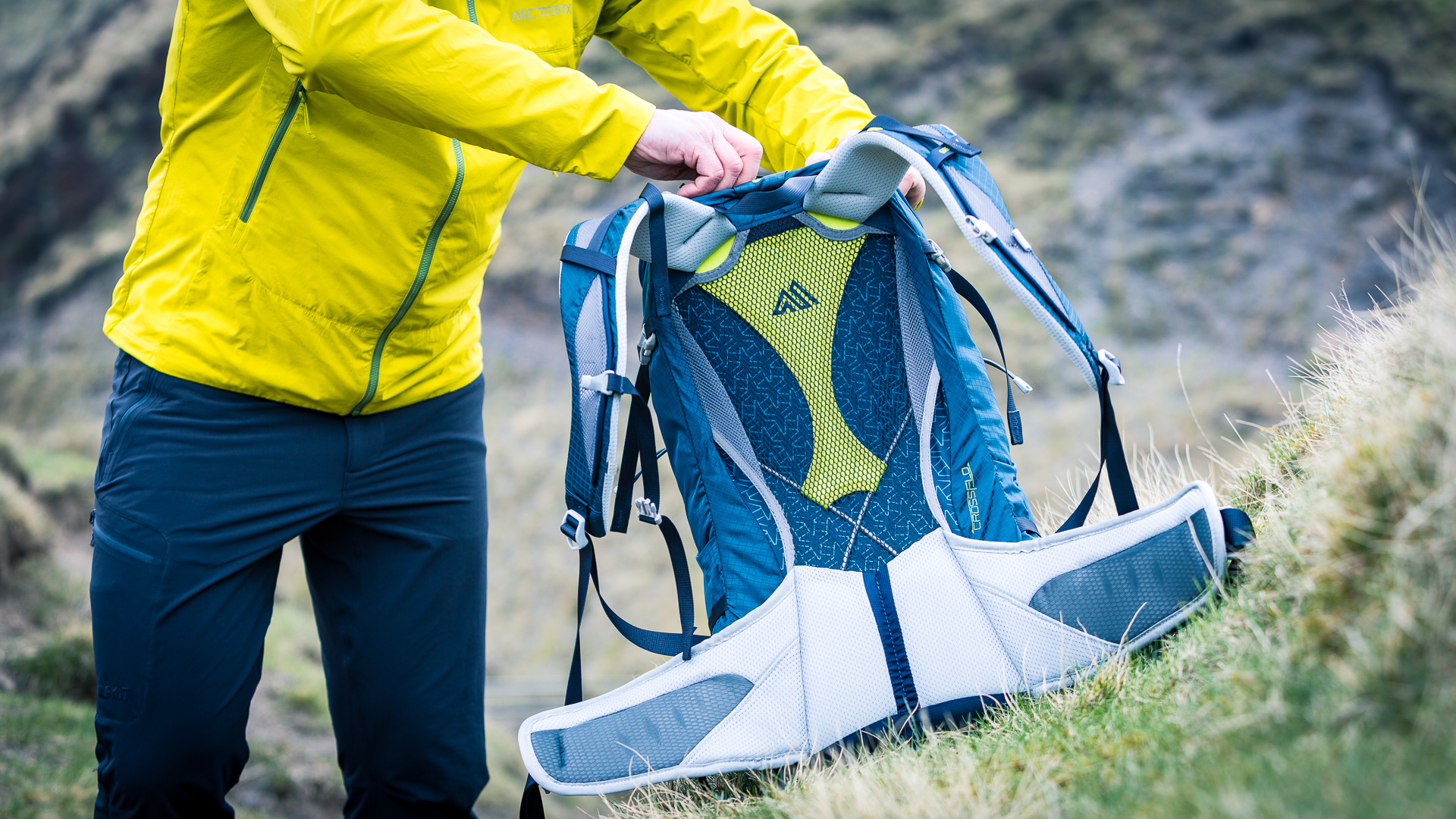 Ventilated hill and mountain walking daypack / Hybrid top-loading / zippered main compartment opening / front and side stash pockets / ‘lid’ pocket / twin axe/pole holders / hydration sleeve / two hip-belt pockets / ventilated Crossflow back system / available in medium and long back lengths / sun-glasses holder
