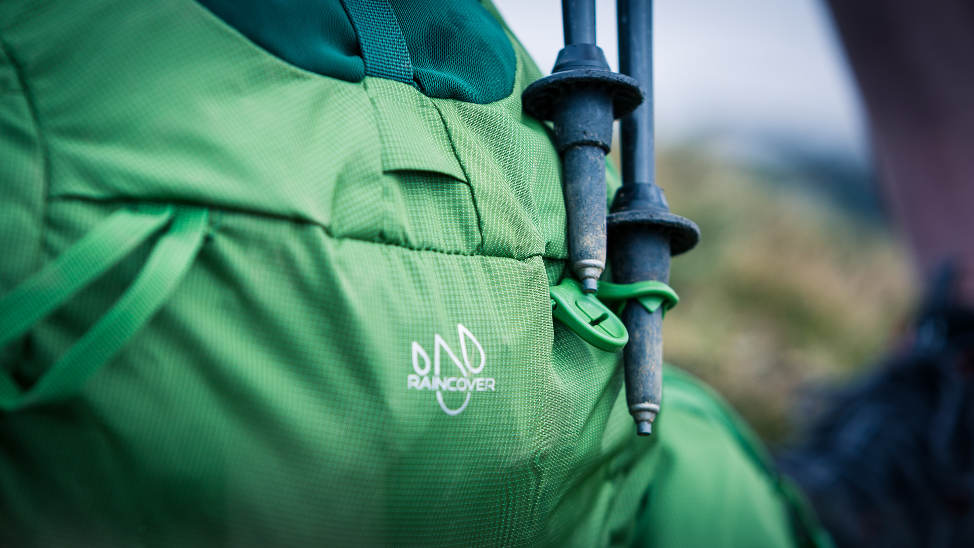 Hill and mountain walking daypack with vented back system / AirZone tensioned mesh / Adaptive Fit harness / padded hip-belt with pockets / compression straps / zipped side pockets / side and front stash pockets / sternum strap with whistle / hydration compatible / TPU walking pole holders / ice-axe loop / key-clip / rain cover in base.