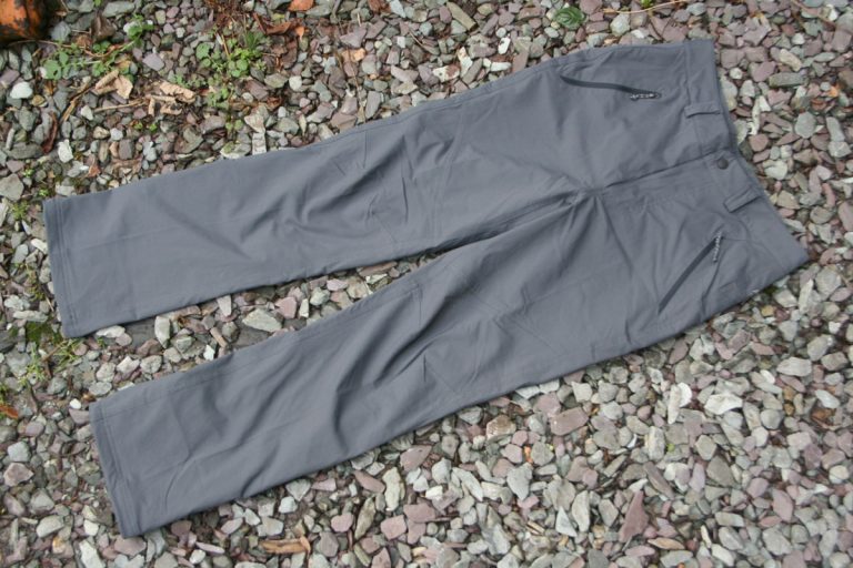 Soft shell trekking trousers on the outside, waterproof and stretchy on the inside.