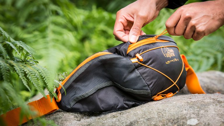 Neat, hooded Houdini windproof jacket from Patagonia is ideal for trail-running use and packs down into its own pocket for compact stowage on the move.